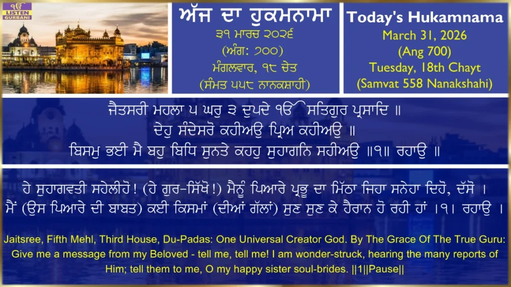 Hukamnama Sri Harmandir Sahib Ji - March 31st, 202