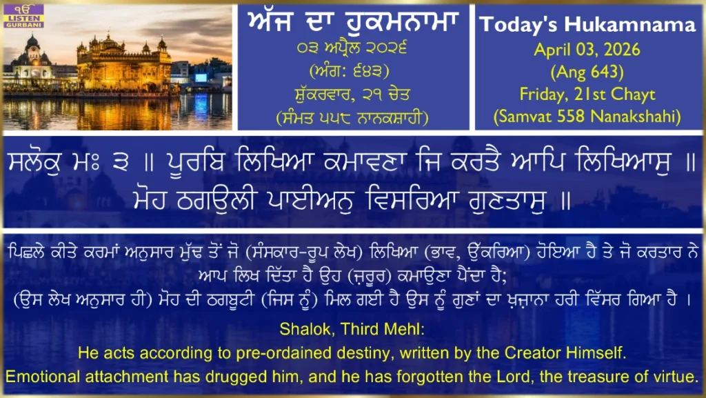 Hukamnama Sri Harmandir Sahib Ji - April 3rd, 2026